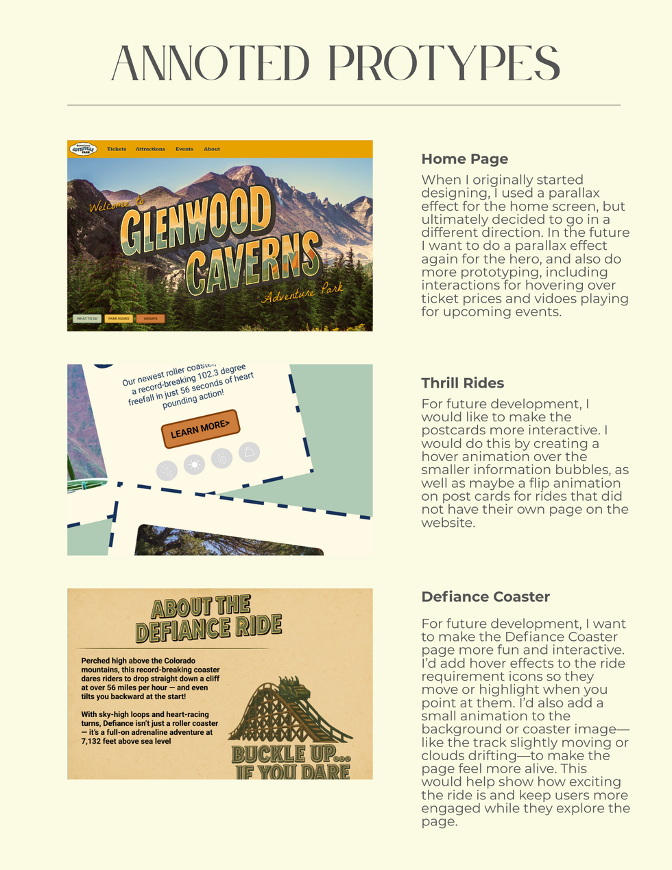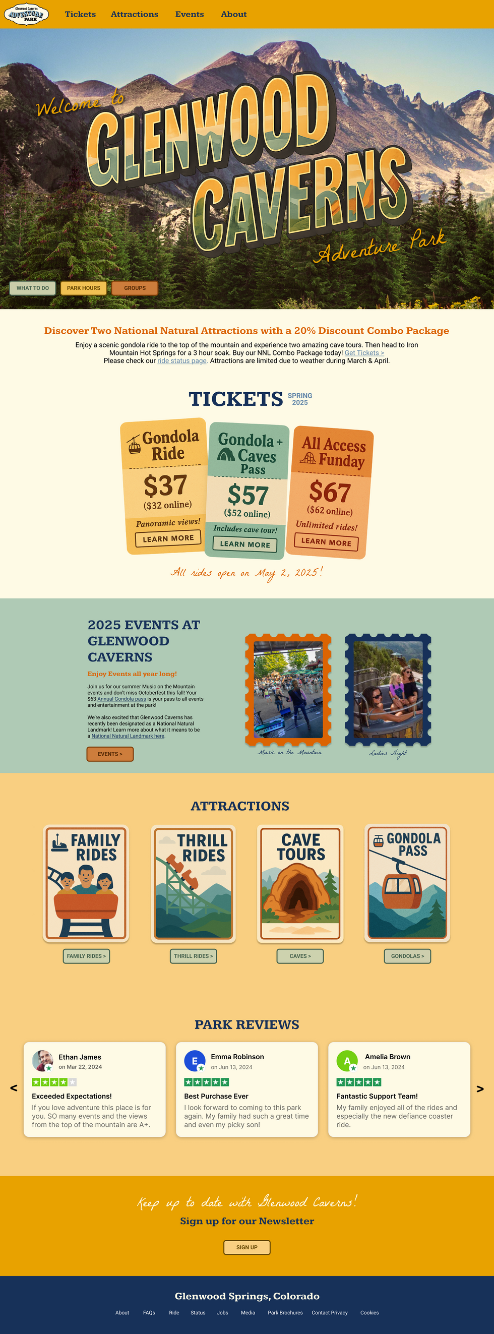 As part of a group project, I led user research and contributed to the redesign of the Glenwood Caverns Adventure Park website, with the goal of strengthening its brand identity and improving the user experience. I designed a new homepage that highlights the park’s adventurous spirit and streamlines key tasks like trip planning and ticket purchasing. I also prototyped an interactive attractions section to help users explore offerings more intuitively. Throughout the project, our team combined research insights with design solutions to create a cohesive, engaging, and user-centered experience across devices.